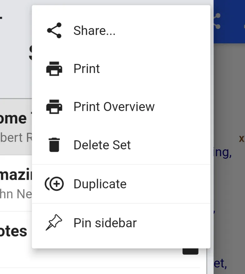 Section titled “Sharing with other SongbookPro users”To share sets with other SongbookPro users, open the sidebar and navigate to the set you with so share. Tap the button to open the sharing menu and choose ‘Share’.